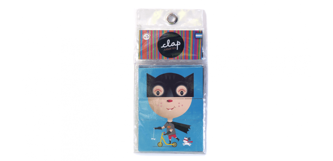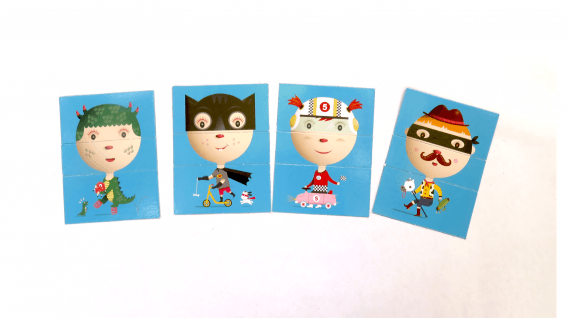Rompecabezas para armar ocho personajes divididos en tres partes, combinando cabezas y cuerpos.