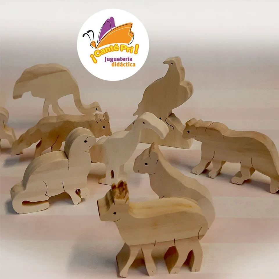 Incluye 11 animales de madera: choique, pudu pudu, condor, pajaro carpintero, puma, bandurria, zorro, huemul, trucha, huellin, y liebre