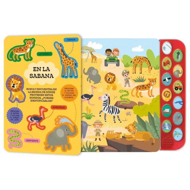Esta colección de libros sorprenderá a los más pequeños con una emocionante búsqueda de personajes y una botonera con doce sonidos, los niños disfrutarán de horas de diversión y aprendizaje. Estos libros seguros y resistentes son perfectos para manos pequeñas.