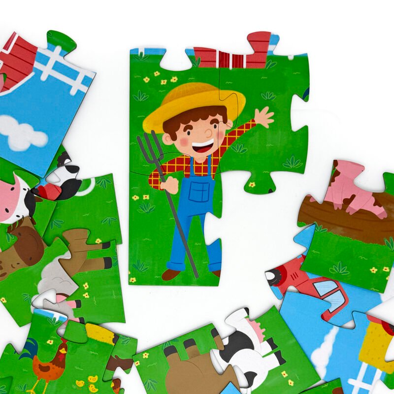 Dos encantadores rompecabezas ilustrados con animales, un granjero y escenas clásicas de la vida en la granja. Con colores vivos, personajes amigables y piezas grandes y resistentes, este set invita a los niños y niñas a explorar, reconocer animales y disfrutar de sus primeras construcciones de manera divertida y segura.